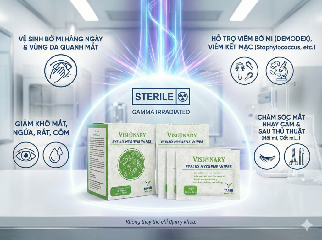 Visionary là dòng gạc vệ sinh mí mắt y tế được tiệt trùng bằng tia Gamma và đóng gói trong túi màng nhôm theo quy chuẩn vô trùng cao. Sản phẩm hỗ trợ làm sạch vùng bờ mi và da quanh mắt, loại bỏ bụi bẩn, ghèn mi và bã nhờn. Hỗ trợ hiệu quả các trường hợp viêm bờ mi (do Demodex), viêm kết mạc (do Staphylococcus spp., S. pneumoniae, H. influenzae, Pseudomonas), khô mắt, ngứa, rát, cộm. Phù hợp chăm sóc vệ sinh sau thủ thuật quanh mắt, theo hướng dẫn cơ sở chuyên môn. Sản xuất theo hệ thống quản lý chất lượng ISO 13485.